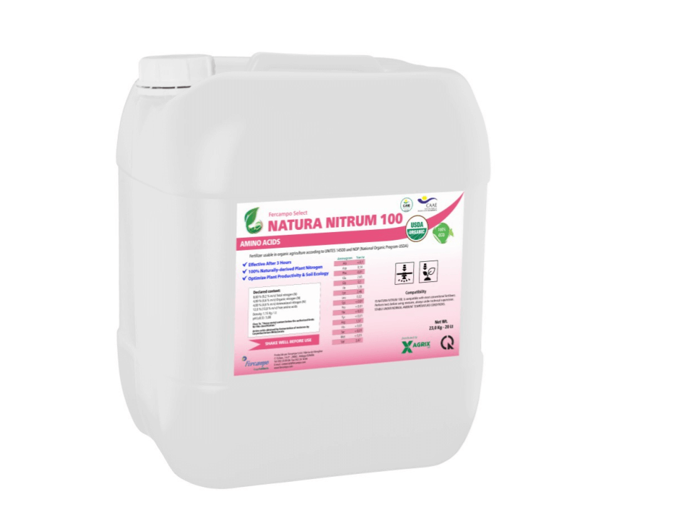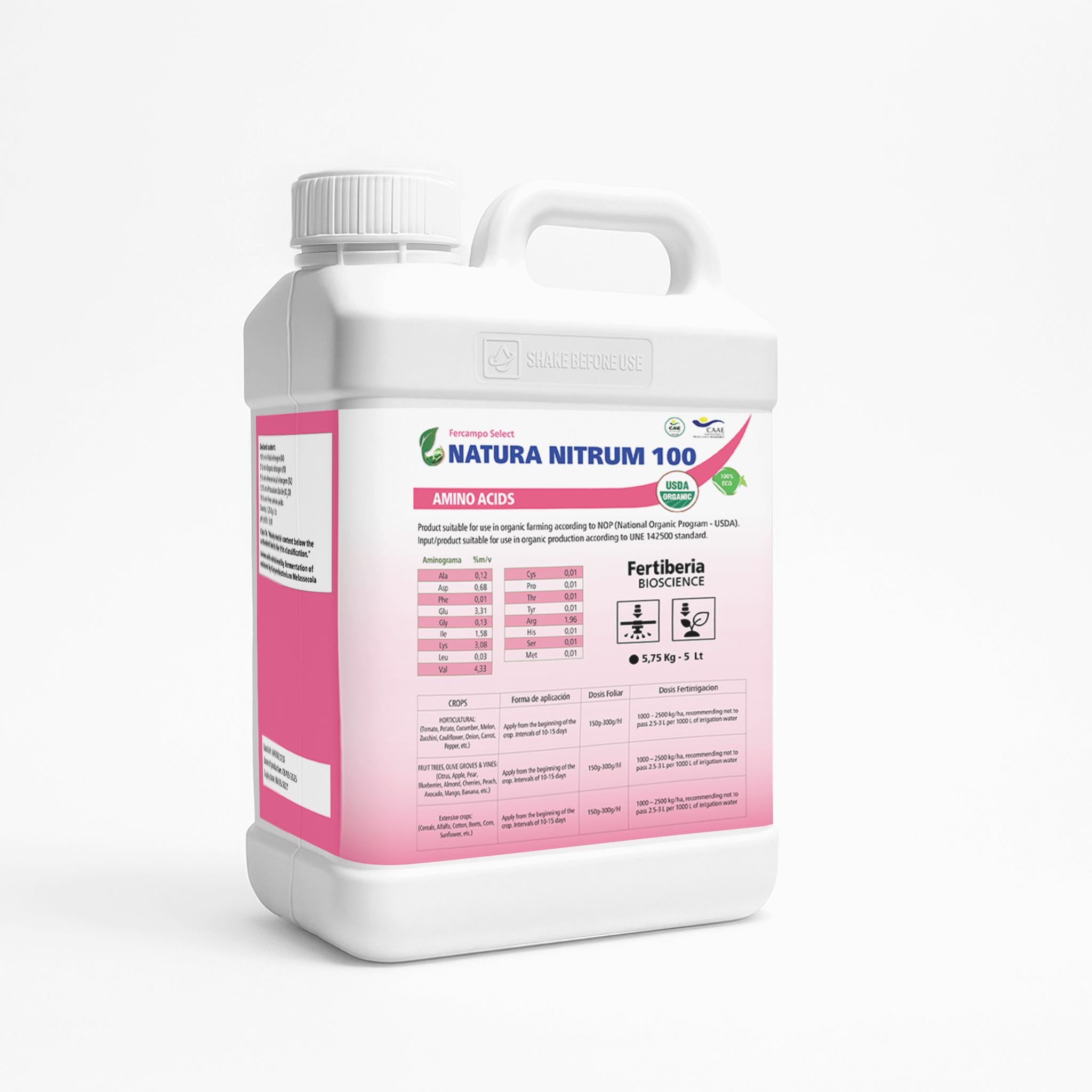 NATURA NITRUM 100 – Dưỡng cây mạnh mẽ, đâm chồi, tạo tán, phục hồi cây từ nguồn gốc hữu cơ. NATURA NITRUM 100 là sản phẩm phân bón hữu cơ cao cấp được sản xuất tại Tây Ban Nha bởi Fertiberia SA và được chứng nhận hữu cơ bởi USDA. Sản phẩm kết hợp các thành phần tự nhiên từ amino axit thực vật, axit fulvic và đạm hữu cơ, giúp tăng cường sức khỏe và sự phát triển mạnh mẽ cho cây trồng. Với thành phần chính giàu tryptophan, NATURA NITRUM 100 đặc biệt hiệu quả trong việc kích thích ra rễ, phục hồi cây trồng sau thu hoạch và sau giai đoạn sâu bệnh.
